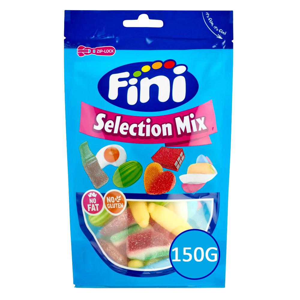 Satisfy your sweet tooth with this pouch of Fini Selection Mix. This mixture of assorted candies includes watermelon slices, filled straws, cola bottles and more.