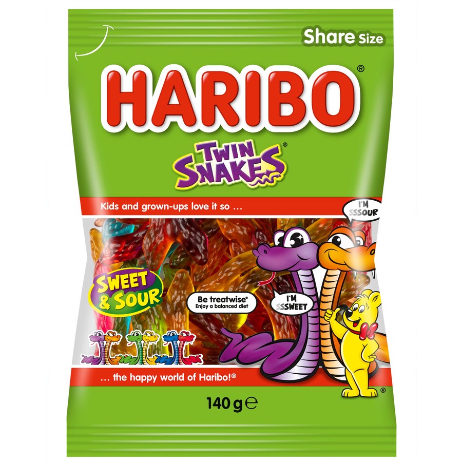 Sssweet and Sssour Twin Snakes are closely coiled together in a pack of delicious gummies with flavors like Cherry & Orange, Apple & Lemon, and Blueberry & Blackcurrant. Eat them together or pull them apart for double the fun!