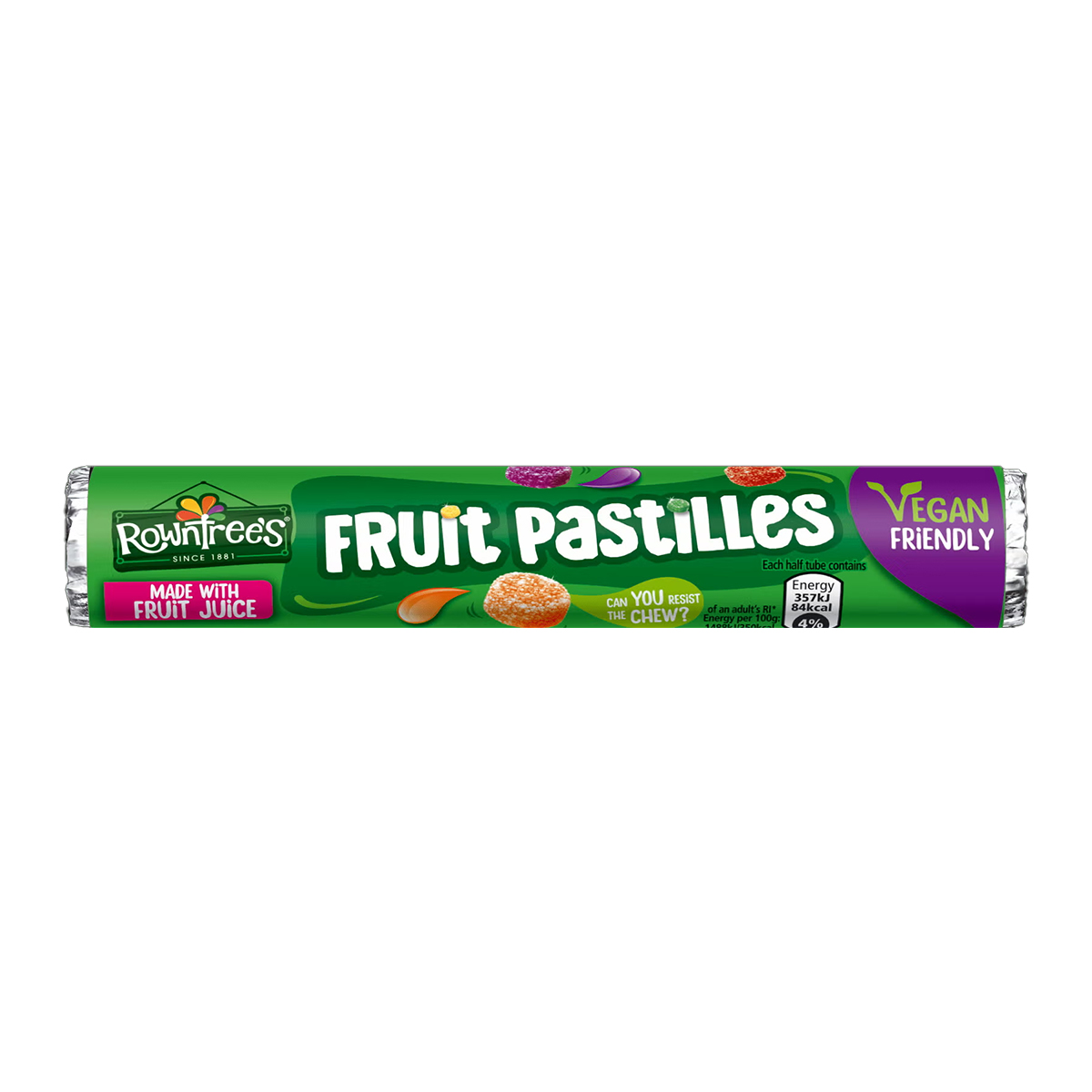 If you’re looking for a chewy, fruity-flavoured sweet, try the irresistible taste of Rowntree’s® Fruit Pastilles. Every paper tube contains a mixture of five fantastic flavours: blackcurrant, lemon, strawberry, lime, and orange. Whichever one is your favourite, every pastille promises a burst of fruity flavour. You’ll never know which fruity sweet is next!